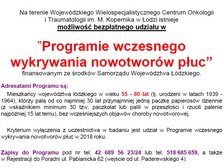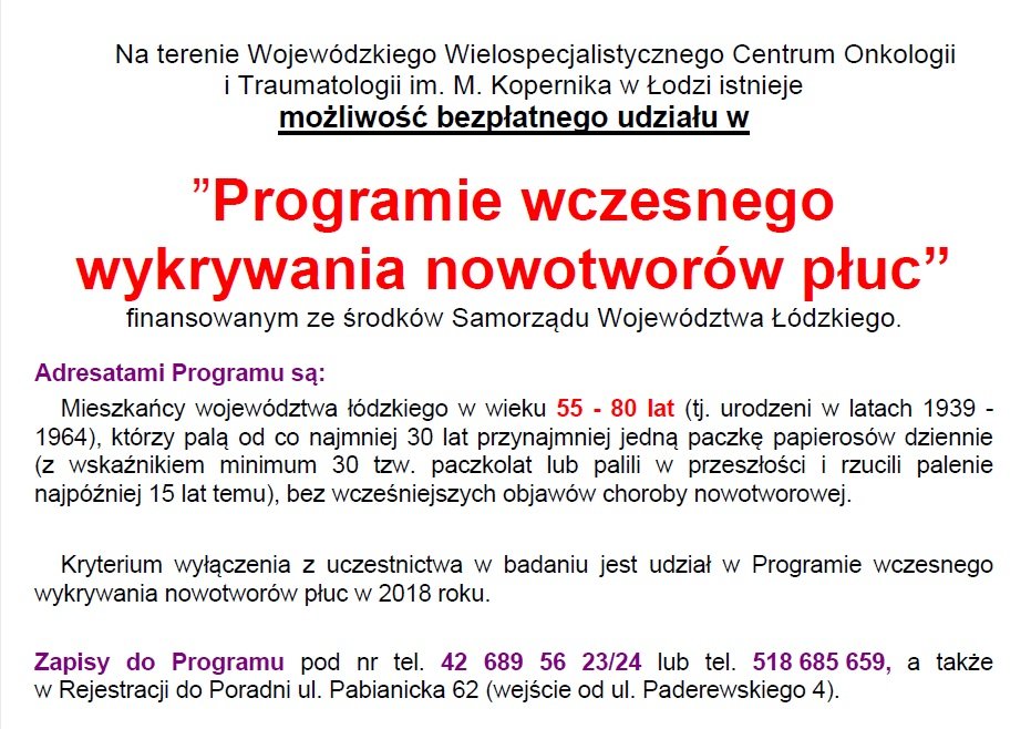Na terenie Wojewódzkiego Wielospecjalistycznego Centrum Onkologii i Traumatologii im. M. Kopernika w Łodzi istnieje możliwość bezpłatnego udziału w ”Programie wczesnego wykrywania nowotworów płuc”, finansowanym ze środków Samorządu Województwa Łódzkiego. Adresatami Programu są mieszkańcy województwa łódzkiego w wieku 55 - 80 lat (tj. urodzeni w latach 1939 - 1964), którzy palą od co najmniej 30 lat przynajmniej jedną paczkę papierosów dziennie (ze wskaźnikiem minimum 30 tzw. paczkolat lub palili w przeszłości i rzucili palenie najpóźniej 15 lat temu), bez wcześniejszych objawów choroby nowotworowej. Kryterium wyłączenia z uczestnictwa w badaniu jest udział w Programie wczesnego wykrywania nowotworów płuc w 2018 roku.
